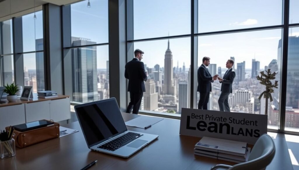 A modern, clean-lined office desk with a laptop, calculator, and a stack of papers labeled "Private Student Loans". Warm natural lighting filters through large windows, casting a soothing glow. In the background, a wall-mounted display showcases various loan options and interest rates, presenting a comprehensive overview. The overall atmosphere evokes a sense of professionalism, financial responsibility, and an emphasis on personalized guidance for the prospective student loan borrower.